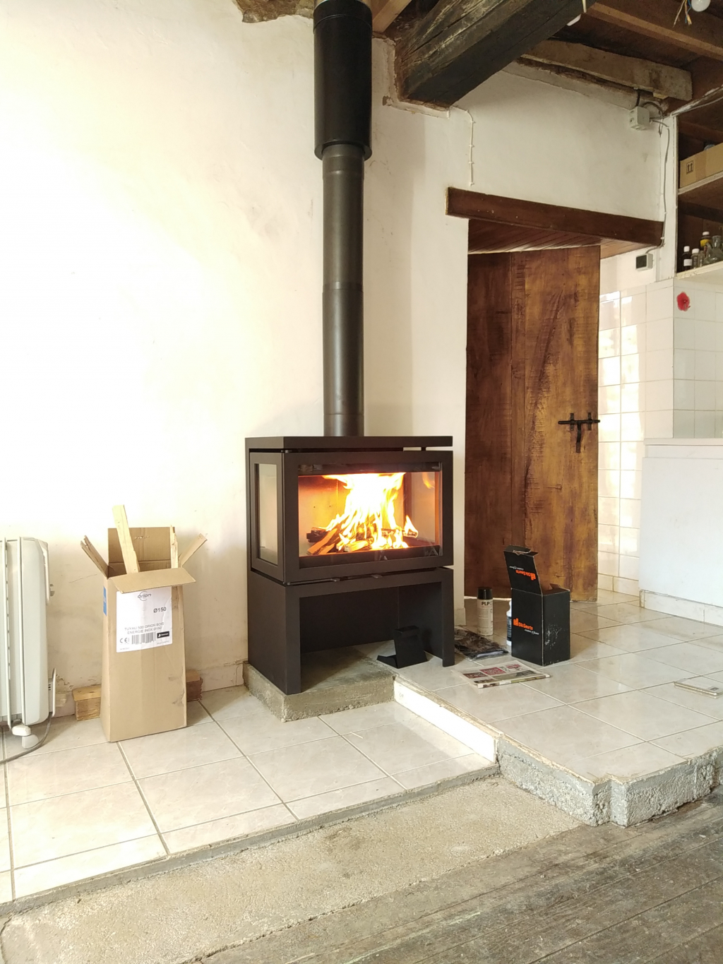 Pose d'un poêle à bois haute performance lors d'une rénovation complète de maison.