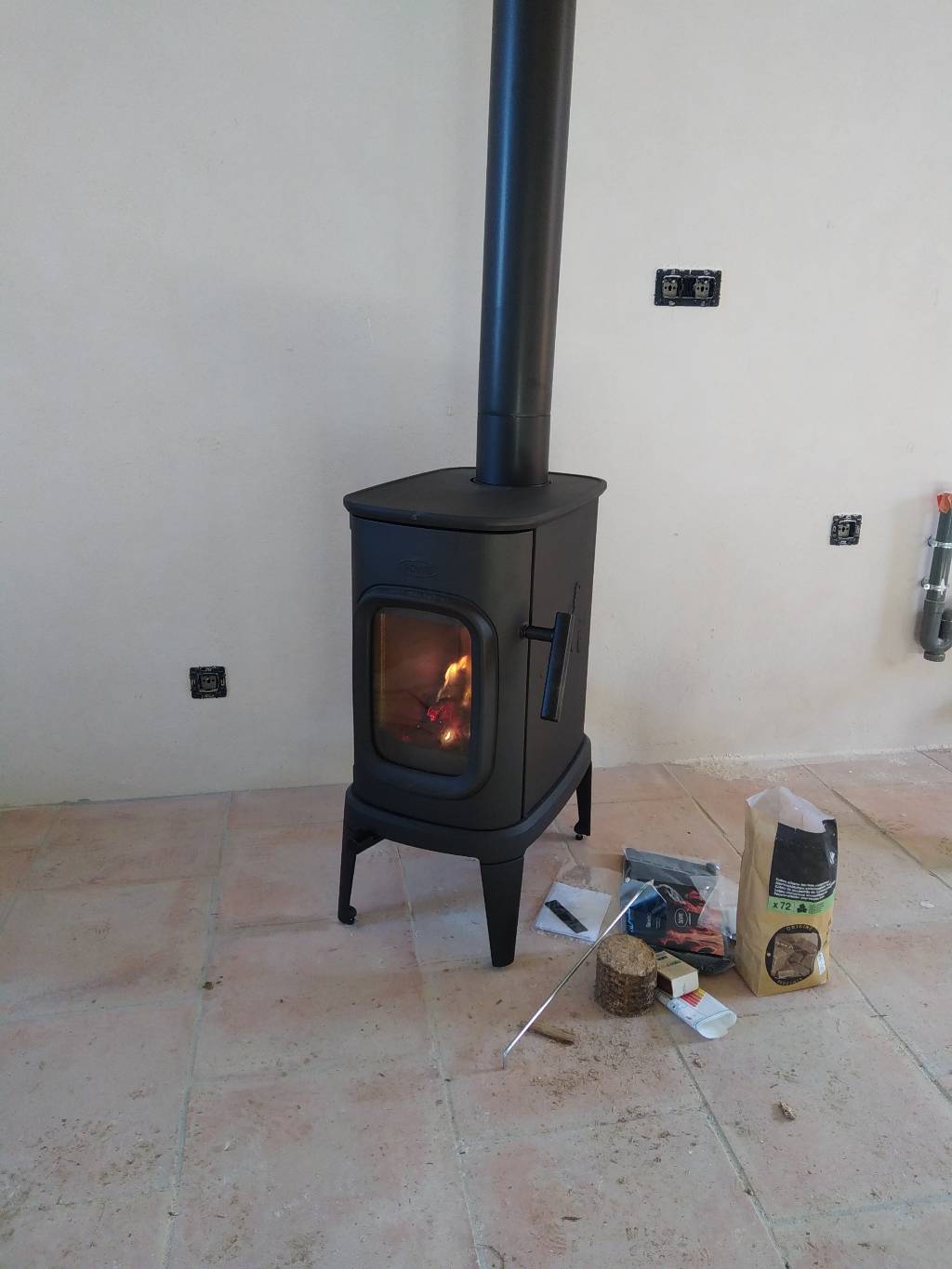 Dans un gîte de Notre Dame de Lorette, l'équipe d'Alter Energies a posé un poêle à bois (bûche) de la marque Dovre modèle SAGA 101 côté plein et créé son conduit de fumée avec prise d'air direct.
