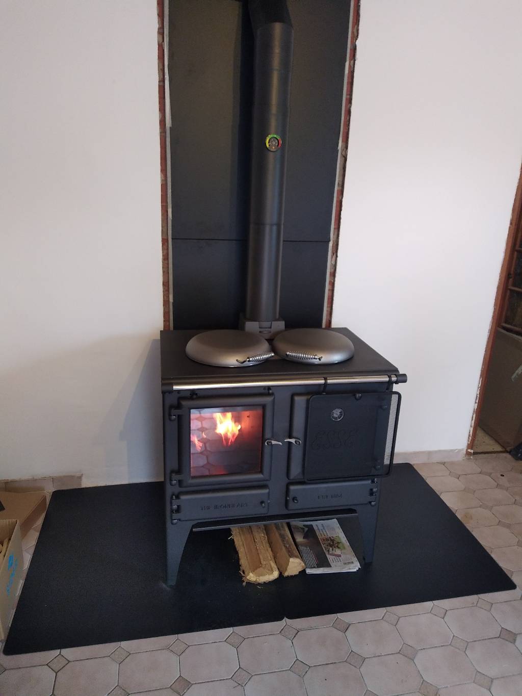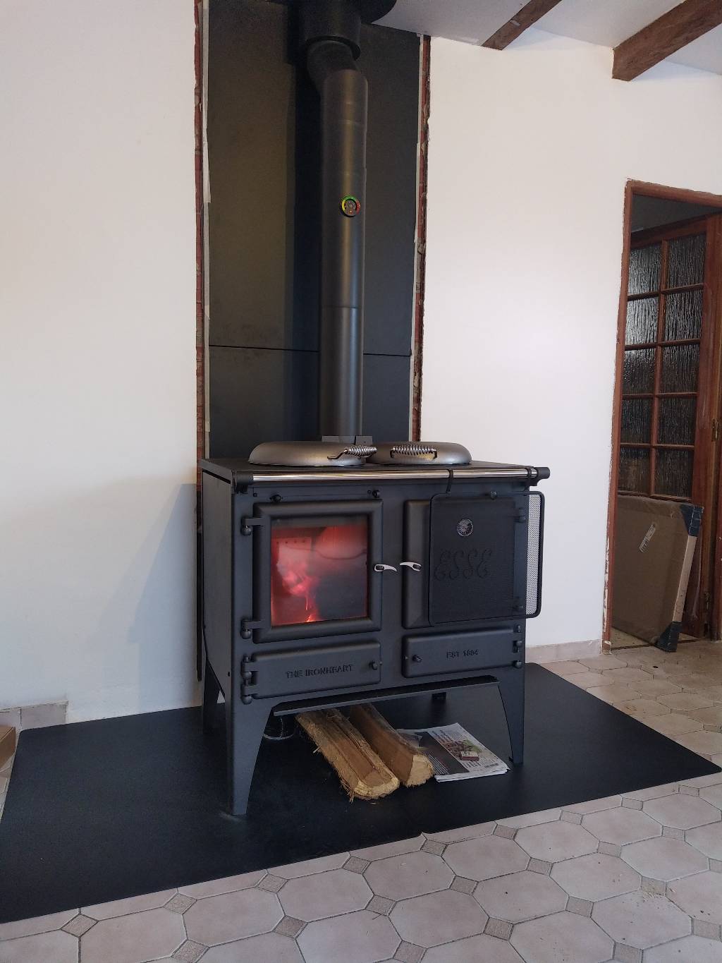 La solution finale en fonction des coûts d'investissement a été de démonter la cheminée pour d'une part gagner de la place et ensuite l'installation d'une cuisinière bois ESSE modèle IRONHEART d'une puissance 7.6kW, un rendement de 80% et des bûche de 50cm, et un poids de 370kg.