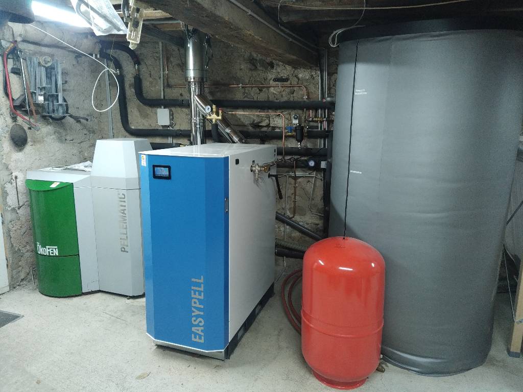 La chaudière à granulé est couplé sur le ballon tampon et elle est commandé automatiquement en cas de manque de chaleur en bois bûche.