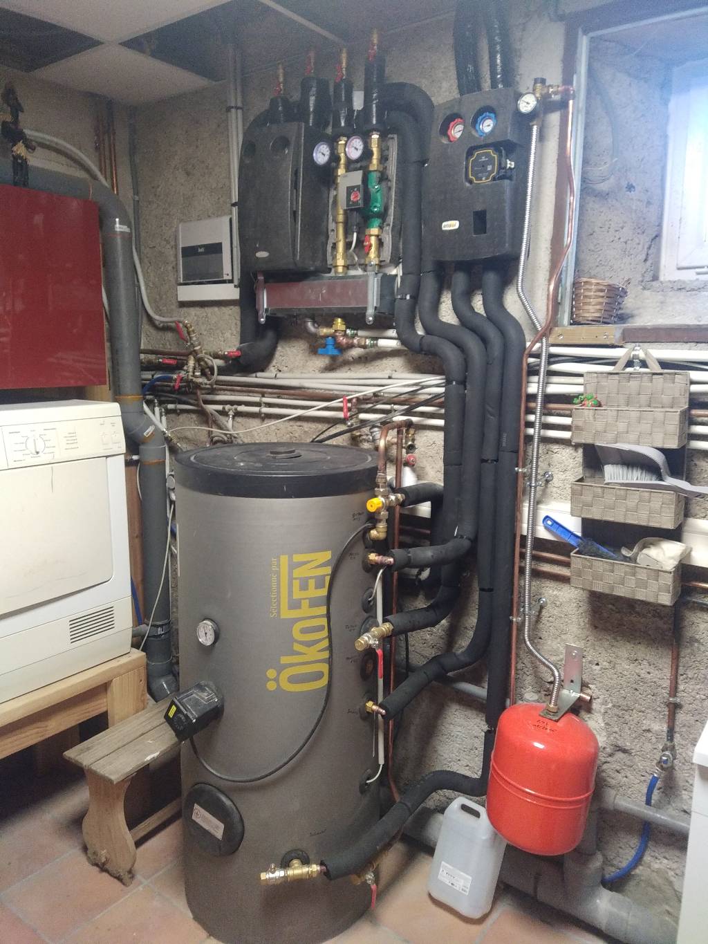 Après une visite technique de la maison et en écoutant les attentes des clients, nous avons proposé une chaudière à bois bûche avec la chaudière à granulé de bois OKOFEN en appoint en cas d'absence de bois dans la chaudière ou hors gel.