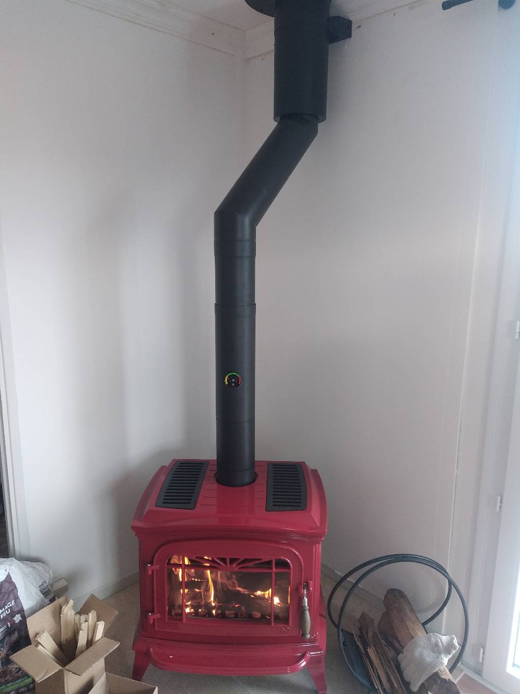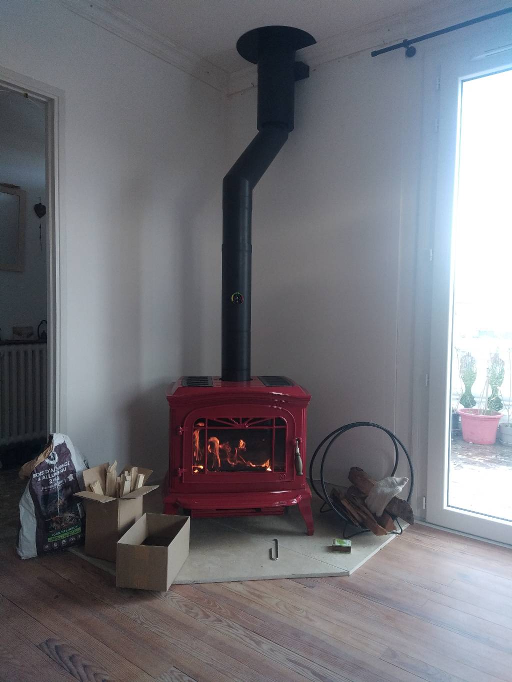 Cette cliente nous a contacté à l'automne avec l'idée de faire installer un poêle à bois. Elle voulait pouvoir en profiter pendant l'hiver. Notre technicien a pu rapidement lui établir des devis. Son choix s'est porté sur le modèle Bradford de chez Invicta, un modèle rouge.