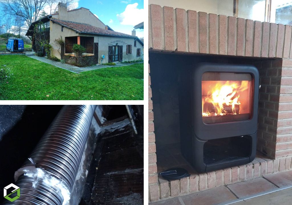 Pose d'un poele à bois dans une cheminée ouverte avec un conduit isolé JEREMIAS dans le boisseau